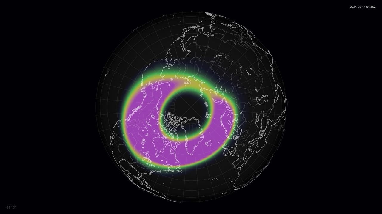 NOAA's Space Weather Prediction Center operates an aurora intensity product using the OVATION model, which has been available on earth.nullschool.net for several years. I quickly put together some time lapse animations of the solar storm event and uploaded them to YouTube: