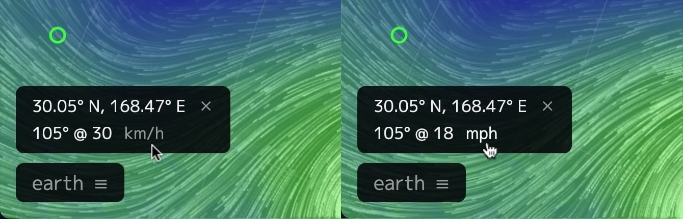 Each overlay has a set of supported units you can cycle through. Note that some layers support only one unit, like % Relative Humidity, so clicking the label has no effect.