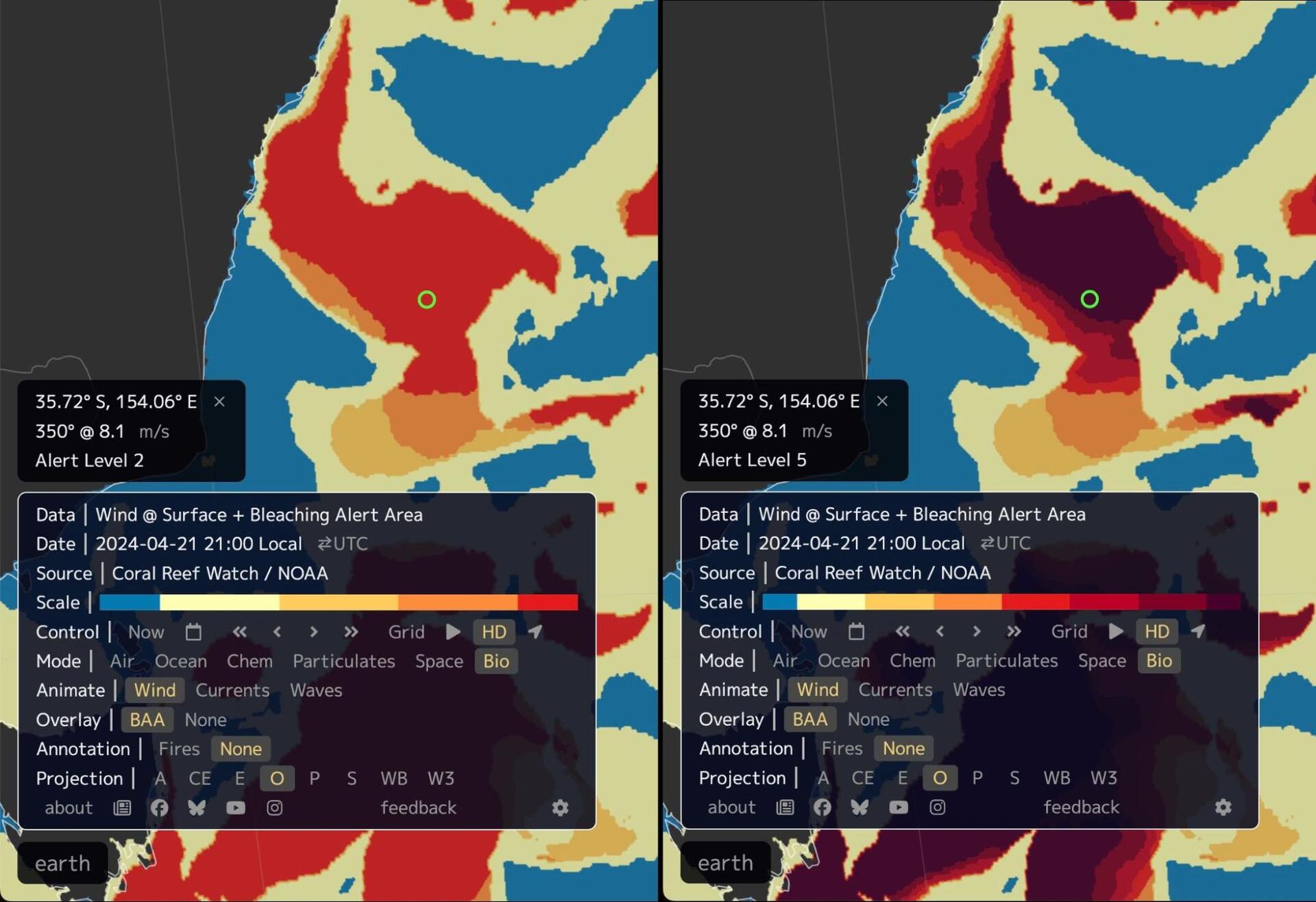 The updated Bleaching Alert Area product is now available on earth.nullschool.net as the "BAA" overlay, same as before. I kept the color palette consistent between updates by introducing darker shades of red for only the additional alert levels while leaving the original colors unchanged. The data has been backfilled to January, 2014. You can check it out here: link